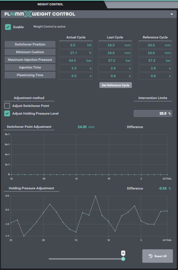 - Reference Cycle contains the predefined reference values used to stabilize product weight. These target values help ensure consistent shot weight.