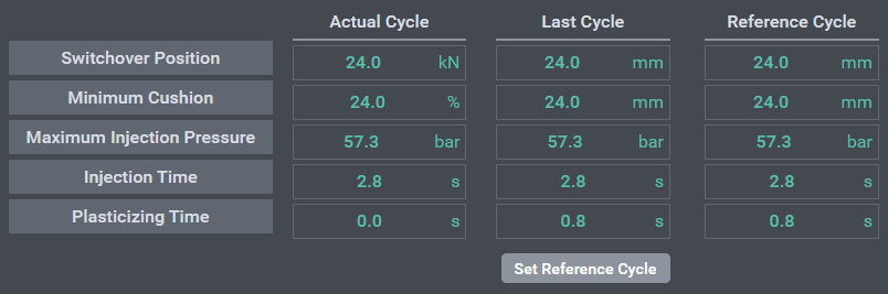 After the injection process is completed, the data from the Actual Cycle is automatically copied here.
