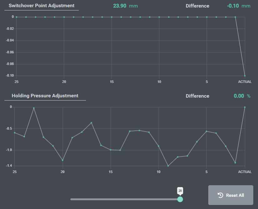 - In this example, the system applied a consistent -10.00% holding pressure adjustment, indicating that a lower pressure was used to maintain stable part weight.
