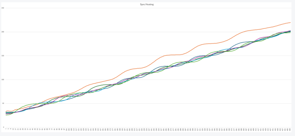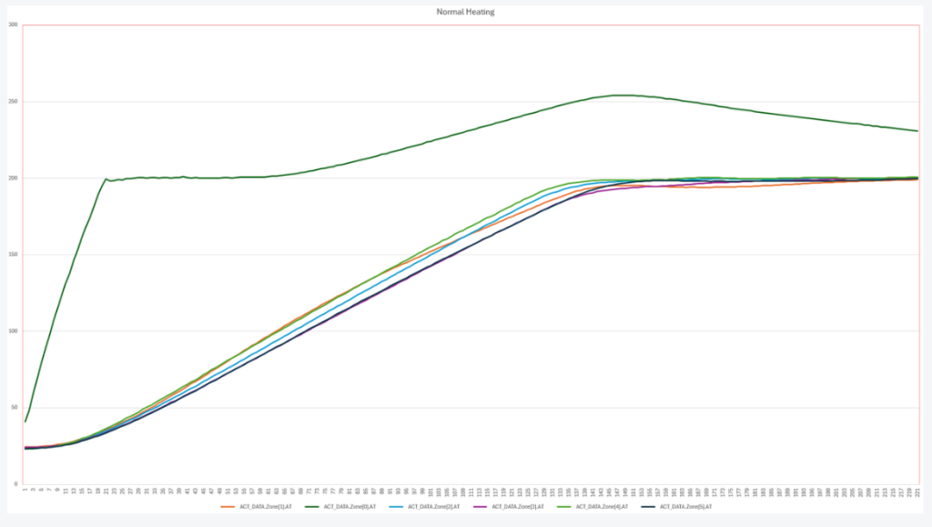 The Synchronized Heating feature was successfully tested and verified. While the approach significantly increases the total heat-up time compared to standard heatup, it ensures that all zones reach target temperatures within a narrow tolerance window.
