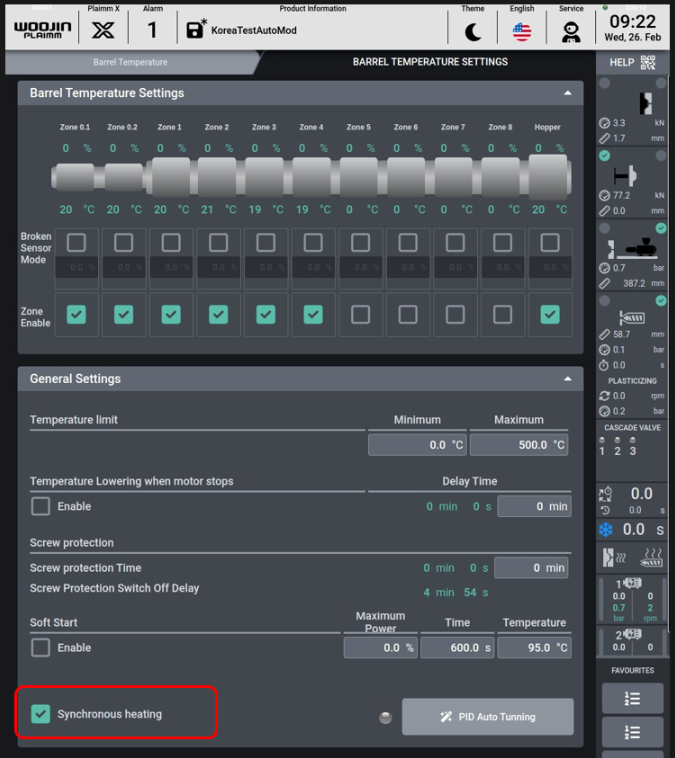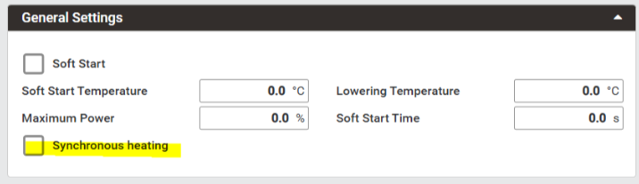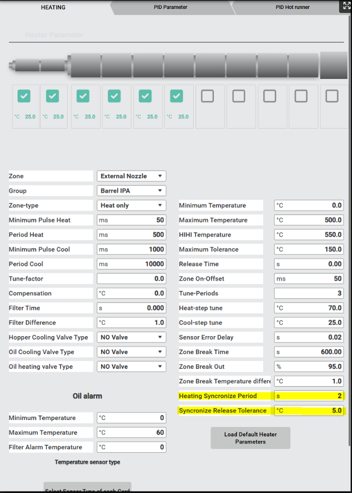 Starting with version UF.510.1, a new Synchronized Heating feature is available for barrel and internal hotrunner heating. The goal is to bring all heating zones into the defined tolerance range simultaneously using a configurable synchronization period and temperature margin.